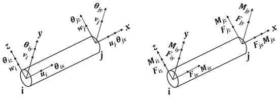In addition to investigating the impact between the drillstring system and the wellbore and riser, this paper also focuses on analyzing the impact of riser movement on the drillstring system. Due to the significant length-diameter ratio of the drillstring system, a finite element method is employed to discretize both the drillstring and BHA components into multiple units for a more comprehensive analysis of their dynamic characteristics. The joint displacement and stress of each unit in the drillstring are illustrated in Figure 3. In this Figure, is the longitudinal displacement, are the deflections, is the rotation angle. The node displacement and force vector ,, and the displacement of the drillstring element are calculated as Equations (9)–(11).