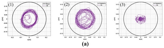 In this section, we conducted simulations and analyses of the dynamic responses of the drillstring at various positions while maintaining a constant deep-water drilling system dynamic model with a rotation speed of 60 rpm and varying WOB values of 12 t, 16 t, 20 t, and 30 t. We then analyzed the motion state of the drillstring based on displacement information from three sampling points. The resulting motion trajectories and animations for points (1), (2), and (3) under different WOB conditions are presented in Figure 4 and Figure 5.
