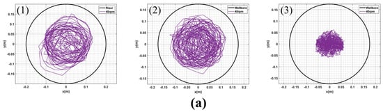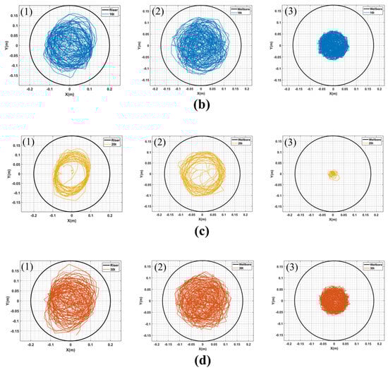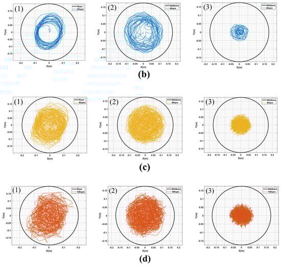 (a–d) are the motion trajectories of points (1), (2) and (3) of the drillstring under the condition that the rotating speeds of 8 t WOB are 40 rpm, 60 rpm, 80 rpm and 100 rpm, respectively.