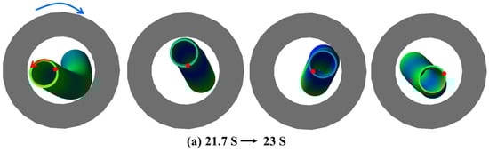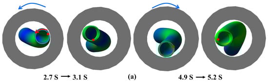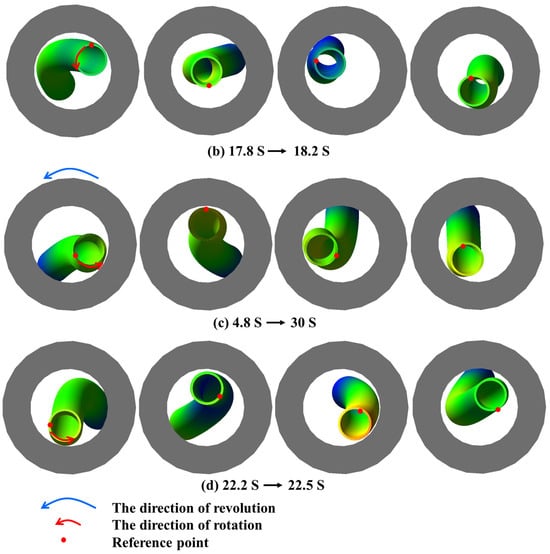 In this section, we focus on investigating the impact of rotational speed on the dynamics model of the deep-water drilling system. Under a constant riser force, simulation analysis is conducted with a fixed WOB of 8 t and varying rotational speeds of 40, 60, 80, and 100 rpm, respectively. The motion animation of the drillstring is presented in Figure 8 and Figure 9 by plotting the trajectory of drillstring points (1), (2), and (3).