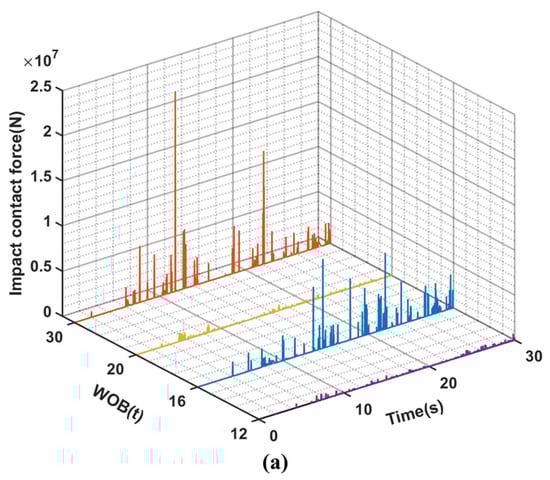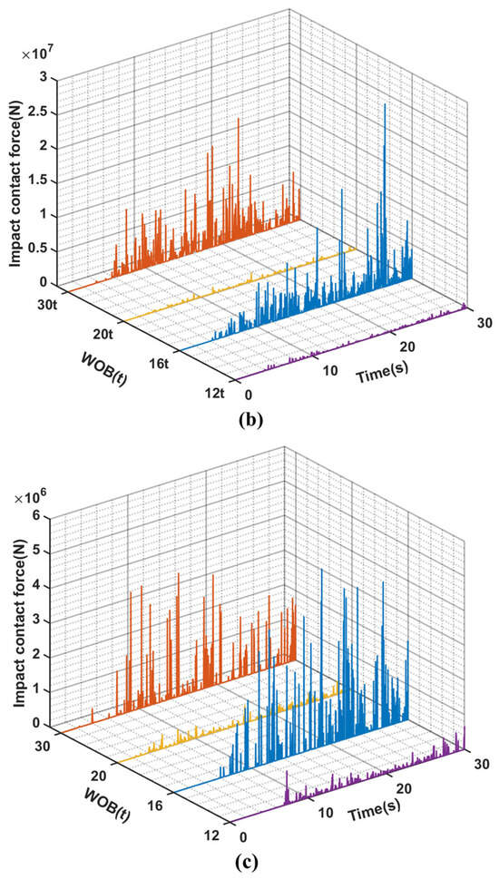 (a–c) are, respectively the time-varying curves of impact force between riser and drillstring, drillstring and borewellbore, BHA and borewellbore under different WOB conditions at 60 rpm.