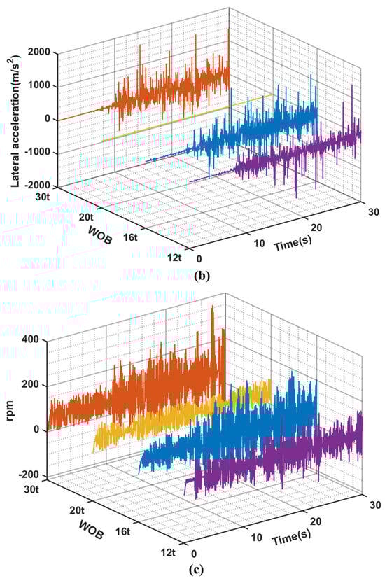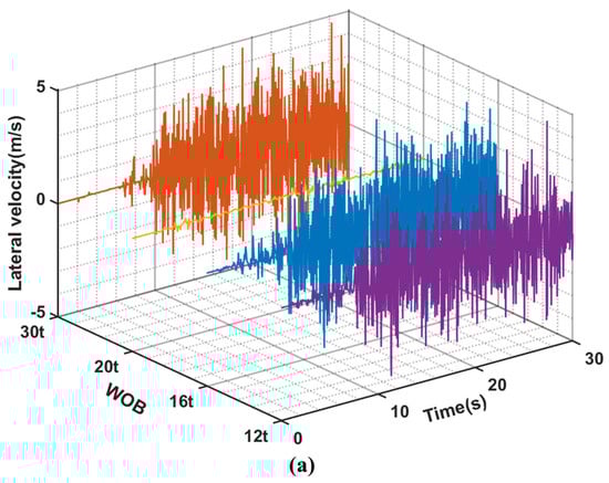 (a–c) are the curves of lateral speed, lateral acceleration and rotational speed with time at position (3) under different WOB conditions when the rotational speed is 60 rpm.