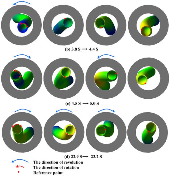 (a–d) are the are the simulation animation of drillstring system under the condition that the rotating speed of 60 rpm is 12 t, 16 t, 20 t and 30, respectively.