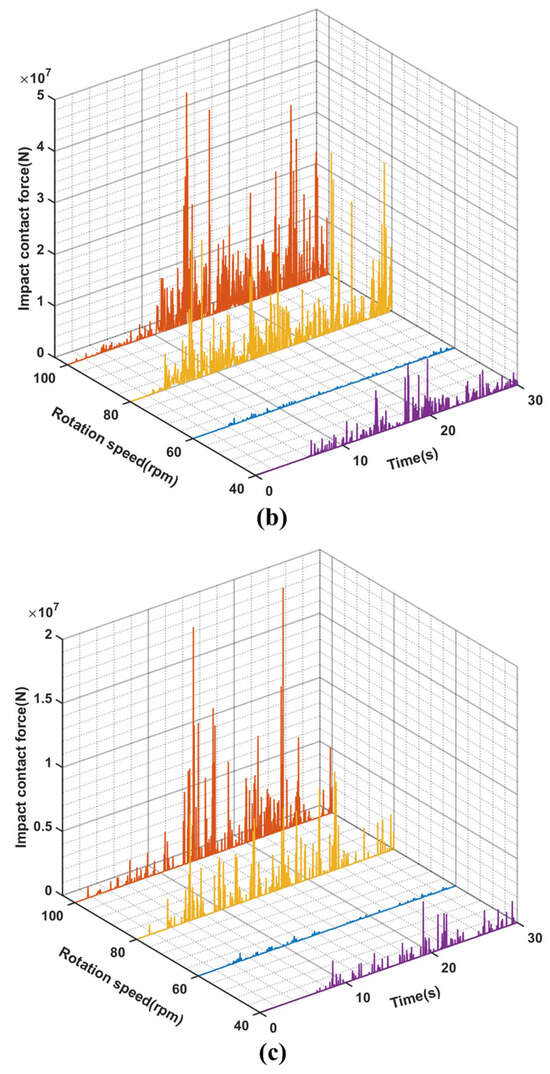 (a–c), respectively show the time variation curves of impact forces between riser and drillstring, drillstring and wellbore, and BHA and wellbore under different rotational speeds at WOB 8 t.
