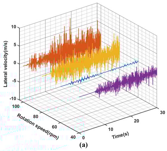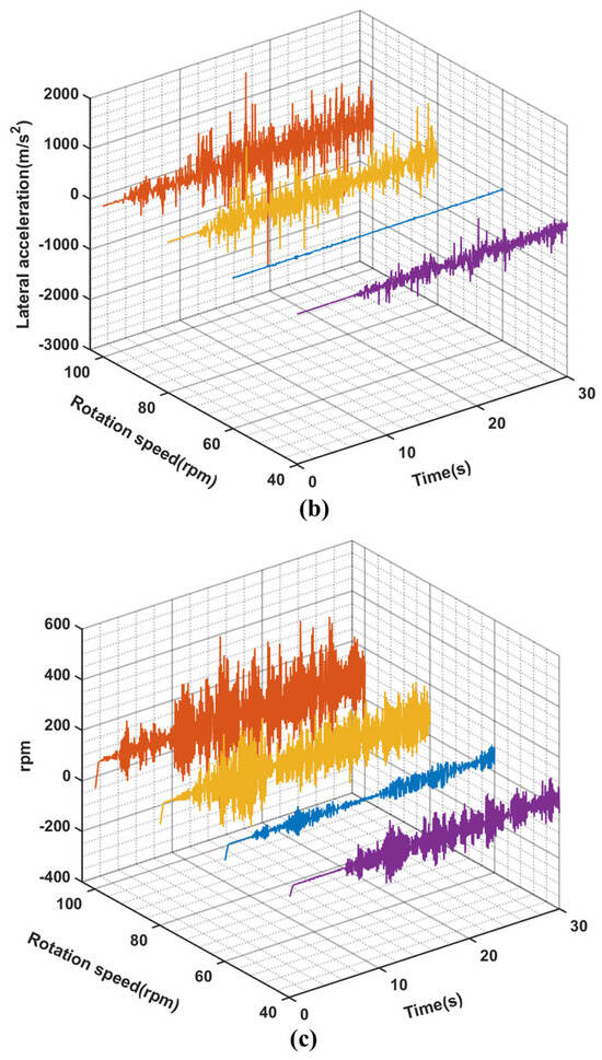 (a–c) are the curves of lateral speed, lateral acceleration and rotational speed of position (3) with time under different rotational speeds when the WOB is 8 t.