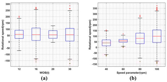 (a,b) are the rotating speed change of the drillstring system (3) point under the conditions of rotating speed 60 rpm, WOB 12, 16, 20, 30 t, WOB 8 t, rotating speed 40, 60, 80, 100 rpm.