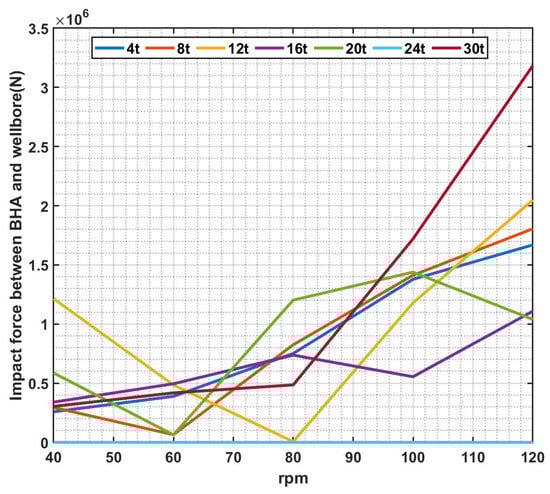 Impact force of BHA with wellbore for different drilling parameters.