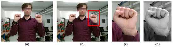 Image processing of the hand gestures for the LoAD building: (a) original image; (b) cropped zone of image; (c) resized image; (d) grey-scale image. For clarity, the (c,d) images are the same size of the original one.