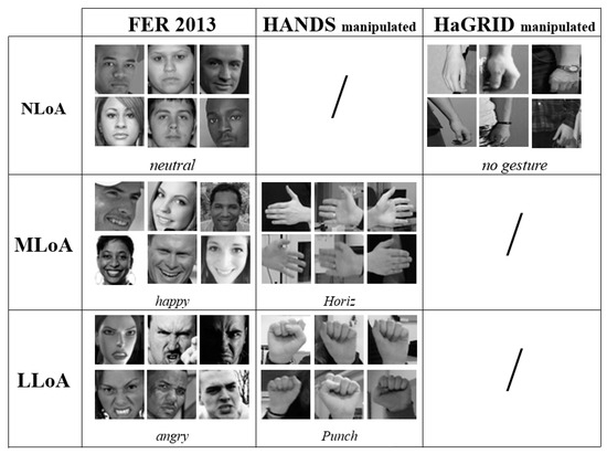 The LoAD was built with images of facial expressions and hand gestures, organized into two different sections. Each of them is made of three classes: Normal Level of Attention (NLoA), Medium Level of Attention (MLoA), and Low Level of Attention (LLoA). The LoAD arises from the union and manipulation of the Facial Expression Recognition 2013 (FER-2013) dataset [49] for facial expressions, HANDS [50] and the HAnd Gesture Recognition Image Dataset (HaGRID) [51] for hand gestures.