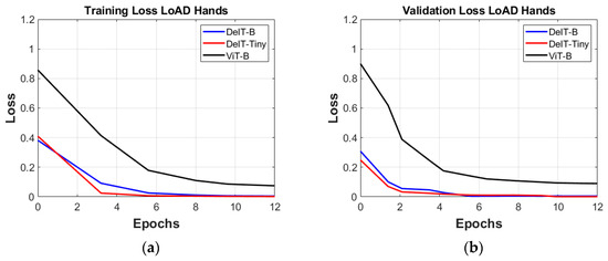 Comparisons among the (a) training loss and (b) validation loss of the ViT architecture applied to the LoAD for hand gestures.