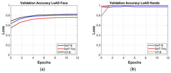 Validation accuracy of the ViT architectures applied to the LoAD for (a) facial expressions and (b) hand gestures.