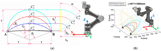 Schematic of the standard and emotional trajectories in the pick-and-place task: (a) the parameters; (b) the spatial development of the trajectories. In (a), four trajectories are reported; although, only three were considered in the present study.