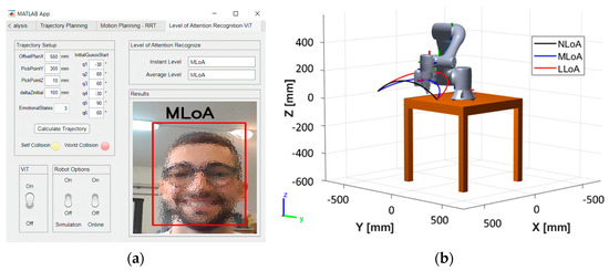 The DT is based on forward and inverse kinematics and trajectory generation algorithms available in the MATLAB libraries [59]. Moreover, it is equipped with a code developed for communication with the ViT by a socket between Pytorch and MATLAB. Finally, it is provided with a developed code for the communication between MATLAB and the interface board. The construction of the DT started with creating the Unified Robotics Description Format (URDF) model of the cobot, which is not available in commercial libraries. Data about the cobot’s kinematic, dynamic, and geometric parameters were assessed in its datasheet [60]. The URDF model includes the cobot support bench and the gripper for the application, used as an end-effector. Then, the previously mentioned algorithms were applied to the URDF by the MATLAB Robotic System Toolbox and a Graphical User Interface (GUI), customized for the application, was developed by the MATLAB App Designer. The Level of Attention Recognition-ViT page (Figure 8a) allows setting points A and B of the standard trajectory (x0, yA, zA, h0, r) to define the initial configuration of the cobot, according to the joints coordinates; to set the number of possible LoAs (parameter n); to visualize the LoA estimated by the ViT (parameters i); and to calculate the corresponding trajectory. When the ViT is on, the DT calculates the trajectory and the speed by (1–11). The page shows the simulated cobot motion (Figure 8b) in a pop-up window. It highlights any robot collisions with itself and the surrounding environment (yellow and red round lines in Figure 8a). Moreover, the page allows the user to choose two work modes: offline, for the simulation of the calculated trajectories, and online, for cobot control, by managing the interface board that generates voltage analog output signals associated with the estimated LoA and, hence, to the trajectory to be executed.