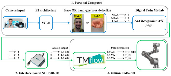 Since the EI-based solution, a simulator of the cobot is necessary before testing the proposed system with a physical cobot in a real application. The novel DT was created because the Omron TM5-700 lacks software for simulating planned tasks. Moreover, a DT is able to exchange data with the ViT architecture and the control unit of the real cobot does not exist. The DT aims to acquire the numerical output generated by the ViT for simulating the trajectory associated with the estimated LoA and, in the application with the cobot, to manage an Interface board for creating the communication between the ViT and the Omron TM5-700 control unit.