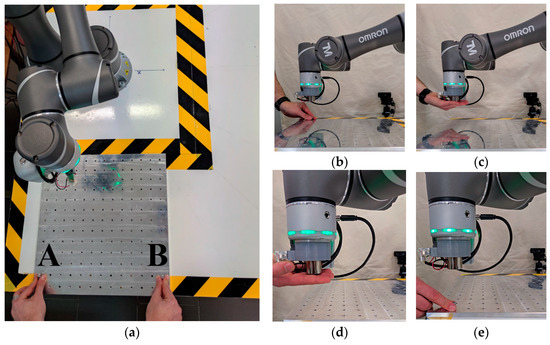 The experimental activity: (a) overview of the testbench; (b) manual removal of the screw; (c) picking task at Point A; (d) release task at Point B; (e) manual placement of the screw.