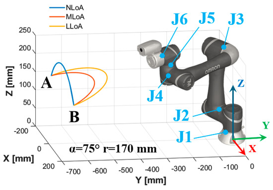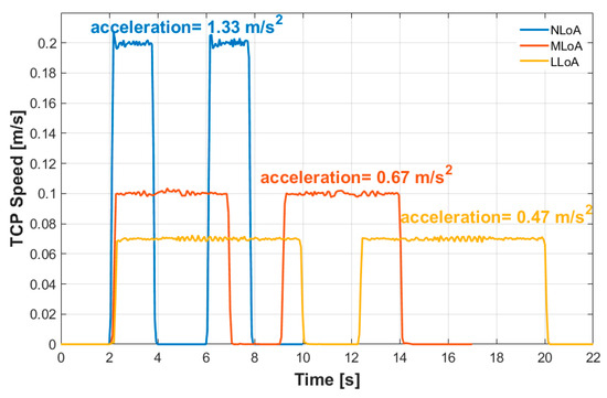 A symmetrical trapezoidal speed profile was set on the TCP: the acceleration and deceleration ramps were defined in terms of ms to reach the set or the zero speed values, respectively (according to the requirements of the cobot software). For each trajectory, the value of the speed, corresponding to the constant value of the speed profile, was set equal to 0.2 m/s, 0.1 m/s, and 0.07 m/s associated with the NLoA, MLoA, and LLoA trajectories, respectively. The highest value of the speed (0.2 m/s) was lower than the highest value of the speed of the cobot working in collaborative mode (0.243 m/s), as imposed by ISO/TS 15066 in the case of accidental contacts between the cobot and the upper arm, forearm, and wrist of the operator. On a page of the cobot software, it was possible to set the body area subjected to accidental contacts and obtain the kinematic and dynamic constraints according to the standard. The other speed values were set based on Equation (11).