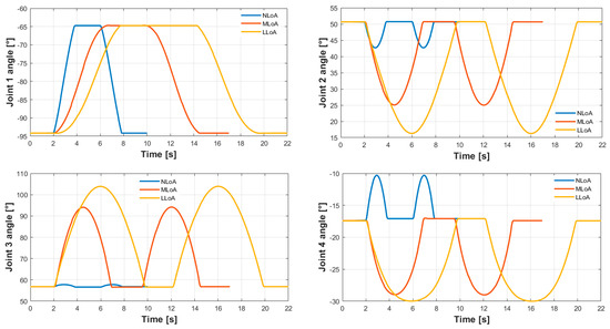 In all the trajectories, the ramp-time duration was set equal to 150 ms, corresponding to the acceleration/deceleration equal to 1.33 m/s2, 0.67 m/s2, and 0.47 m/s2 associated with the NLoA, MLoA, and LLoA trajectories, respectively. Due to these values, the time length of each task (from A to B) equaled about 2, 5, and 8 s for the NLoA, MLoA, and LLoA trajectories, respectively. The picking and the release of the screw required 2 s. The task sequence is shown in Figure 11 in the case of no collisions.