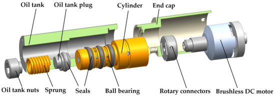 The electro-hydrostatic actuator (EHA) is a high power-to-weight ratio, high-efficiency, highly integrated power-level digital hydraulic system, which mainly consists of motors, pumps, hydraulic cylinders, safety valves, damping bypass valves, displacement sensors, and other parts. It has important applications in various fields such as aerospace, automation, robotics, and so on [1]. The EHA controls the displacement of the piston rod of the hydraulic cylinder by controlling the volumes discharged by the reciprocating motion of the electric pump. This design avoids the traditional hydraulic pump’s need to be put through a small servo system to control the volumes. In this way, it reduces the cost of making and controlling the system and, on the other hand, reduces the amount of leakage of the system fluid, which in turn improves the overall efficiency of the hydraulic system. The first application of EHAs was on the Airbus A380 in 2004 as a position servo system for the aircraft’s rudder, aileron elevator, and spoiler. Since then, the system has also been gradually applied to several other civil and military aircraft, such as the Airbus A400M, Airbus A350, and Embraer’s KC390 [2]. In addition to aerospace, EHAs are often used in the joints of robots and exoskeleton structures due to their small size and high power-to-weight ratio. Kaminaga H. of the University of Tokyo has proposed the use of EHAs in assisted robots, which have great advantages over rigid actuators [3]. At present, the EHA system mainly focuses on the improvement of performance indexes such as operating speed and power to meet the requirements of aerospace, robotics, and other fields. The new generation of automation equipment puts forward higher requirements on the overall structure of the EHA system in terms of being lightweight, miniaturization, and intelligence [4], so the miniaturization of the EHA has become an important direction of current research.
