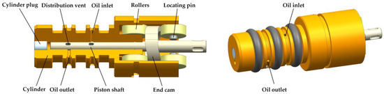 As one of the important original parts in the miniature EHA system, the size and performance index of the micro pump are very important. The micro 2D pump designed in this paper is mainly used to change the motion of the plunger by means of specially curved end cams to have both sliding and rotating motions. Compared with the traditional piston pump that only reciprocates motions for suction and discharge work, the micro 2D pump has a double degree of freedom through the axial reciprocating motion of the piston for suction and discharge work and, at the same time, the rotating reciprocating motion to achieve the function of flow distribution. This design makes the plunger take up less space and, thanks to this structure, the micro 2D pump has a high mechanical efficiency and volumetric efficiency. The pump body is mainly composed of a tank, a sprung, a cylinder, connectors, and other components, and its enlarged view is shown in Figure 1. The micro 2D pump is driven by a brushless DC motor, and the two components are mechanically connected for easy installation and disassembly. The pump body mainly consists of the plug, the roller, the end cam, the plunger, and other structures. In order to show the internal structure, the cylinder has been dissected, and its three-dimensional structure is shown in Figure 2.