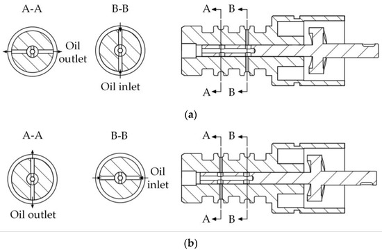 The exact working principle of the micro 2D pump is shown in Figure 3. The diameter of the oil inlet and the oil outlet is 0.6 mm, the size of the flow distribution port is 0.5 mm × 1 mm, and the size of the 2D piston is 2 mm × 30 mm. When the piston rod stroke of the pump reaches the rightmost point, the pump is in the (a) state. At this time, the flow distribution groove is at a low pressure, and the conduction area between the inlet port and the flow distribution port reaches its maximum, so the pump is in the suction state. After the oil is sucked into the flow distribution groove of the pump, with the rotation of the motor, the piston rod rotates and moves axially to the left. During this period, the overlap area between the flow distribution port and the oil inlet port gradually decreases. However, the flow distribution port and the inlet and outlet ports do not conduct. After a small period of time, the conduction area between the flow distribution port and the oil outlet gradually increases. When the piston rod stroke reaches the leftmost point, the flow distribution port and the outlet conduction area reach maximum. The pump is in the state of oil discharge, as shown in (b), so the micro 2D pump has completed a suction and discharge process. In the process of completing the suction and discharge of oil, the motor drives the piston shaft to rotate 180° with the end cam, driving the piston shaft to carry out a reciprocating motion. It is worth noting that during suction and discharge, when the flow distribution port does not conduct with the inlet and outlet ports, because the fluid is incompressible and the volume of the volumetric chamber becomes smaller at this time, the pressure in the fluid chamber will increase. However, since this phase is very short, it does not lead to mechanism seizure or oil leakage.