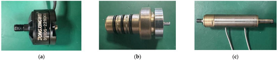 The physical diagram of main components. (a) brushless DC motor; (b) 2D pump; (c) hydraulic cylinder.