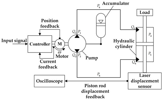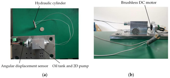 The miniature EHA designed in this paper mainly consists of a brushless DC motor, a micro 2D pump, a hydraulic cylinder, a controller, and a piston accumulator [17]. The main components and their parameters are shown in Table 1, and the physical diagram of each component is shown in Figure 4. The brushless DC motor is used to drive the micro 2D pump forward and in reverse for oil suction and discharge to drive the hydraulic cylinder piston rod movement. The main function of the controller is to drive the motor and protect the hydraulic system. The current of the motor driving the pump increases when the hydraulic system is overloaded, or the pressure is too high. When the current increases to a certain value, the controller controls the motor to maintain maximum current operation to prevent overcurrent burnout, as a way to protect the safety of the hydraulic system. The piston accumulator with a filling pressure of 31.5 MPa and a volume of 0.63 L is connected to the tank of the micro 2D pump by means of a direct connection. Its main function is to prevent oxidation of the oil and compensate for the return of oil to the system. Compared with the traditional EHA system, this miniature EHA removes the check valves, safety valves, and other components with larger volume and mass, further optimizing the structure and reducing the system volume without affecting the overall function of the system [18,19].