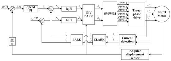 In order to ensure the maximum output of electromagnetic torque from a brushless DC motor, a control method in which is generally used, so that only the quadrature axis current has an effect on the output torque of the electro-mechanical converter [20]. A control system block diagram of the DC brushless motor is shown in Figure 7, which adopts the double closed-loop algorithm of speed and current. The position of the motor rotor is fed back in real-time through the AS5045 angular displacement sensor on the motor backplane, and the position angle is used for the PI control of FOC and the coordinate transformation calculation. This control algorithm allows the motor to have a stable rotational speed, which reduces the flow pulsation of the system and makes the output of the system more stable and smoother [21,22].