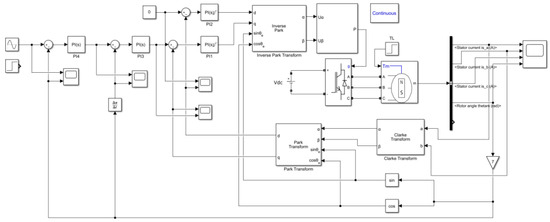 The simulation model of the EHA motor controller is established in Matlab/Simulink, as shown in Figure 8. The parameters of the motor model are shown in Table 2. In order to make the simulation results more in line with the actual effect, each parameter of the motor model is obtained using experimental measurements with the motor, where the inductance and resistance are measured with the LCR, the flux linkage coefficient is derived from the inverse potential, and the rotational moment of inertia is calculated with 3D modeling.
