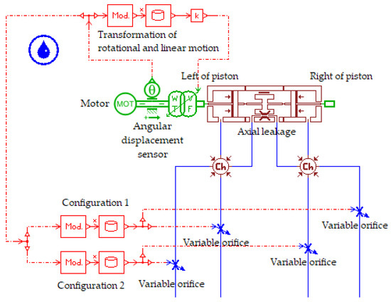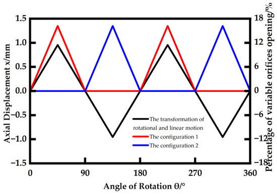 In this paper, the hydraulic system of the miniature EHA is modeled in AMESim. The components can be selected from the existing component library. Since a 2D pump is essentially a 2D piston that rotates and moves axially at the same time, the pump components in the library are chosen to be replaced with a piston block and a linear rotational modulation transformation as shown in Figure 9. Among them, the transformation of rotational and linear motion reflects the correspondence between the rotation angle of the piston shaft of the micro 2D pump and the displacement of the axial motion. For every 180° rotation of the piston shaft driven by the motor, the piston axial reciprocating motion is carried out once for a complete oil suction and discharge. The correspondence between rotation angle and axial displacement is linear, which reflects the double degree of freedom characteristic of the miniature 2D pump. When the position signal input to the motor angle is sinusoidal, the axial displacement of the pump is also sinusoidal. Then, the output flow rate and the displacement value of the piston rod of the hydraulic cylinder are also sinusoidal. By configuring the sequence of the four variable orifices’ conduction to reflect the micro two-dimensional pump inlet and outlet ports, a spatial 90° distribution is presented. Configuration 1 and configuration 2 have a 90° difference in conduction phase. The transformation of rotational and linear motion and the configuration of the variable orifices is shown in Figure 10.