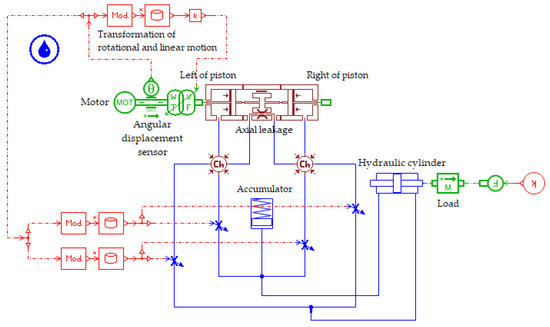 The EHA hydraulic system modeled in AMESim is shown in Figure 11. In the process of modeling the overall EHA system, the influence of each component on the whole system can be fully considered. The main parameters related to the simulation are shown in Table 3.