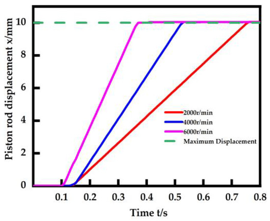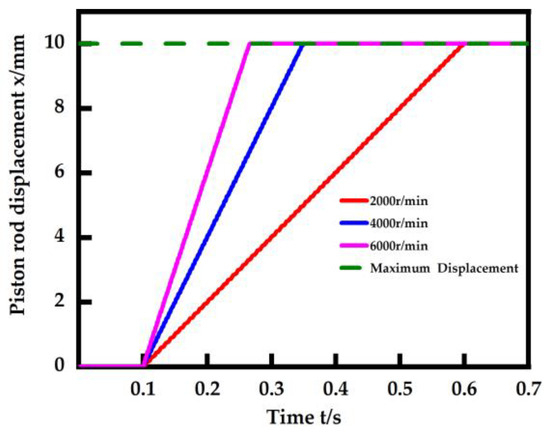 Inputting a step signal in Simulink corresponds to the speed step signal of the motor. At different rotational speeds, the time to reach the maximum displacement of the piston rod of the hydraulic cylinder at different rotational speeds is shown in Figure 13. In the joint simulation environment, when a step signal of 6000 r/min is given to the motor, the rise time of this miniature EHA system is 0.158 s.