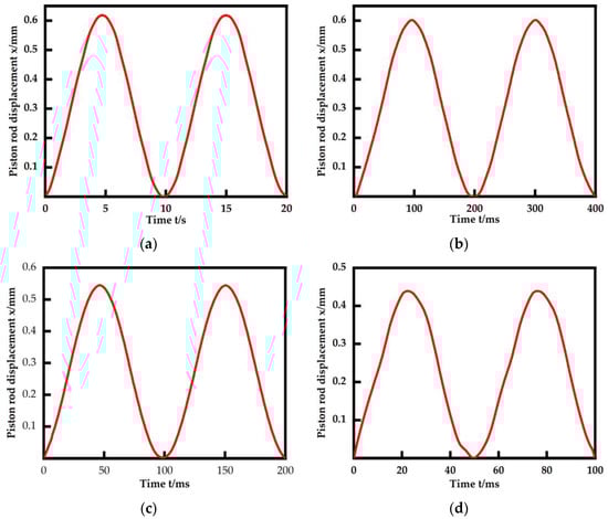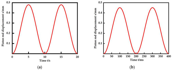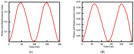The frequency response of the EHA system can be obtained by inputting a sinusoidal signal. The maximum displacement of the piston rod of the hydraulic cylinder is 0.62 mm when the input signal is sinusoidal at 0.1 Hz. The displacement amplitude of the piston rod decays as the input signal frequency is gradually increased, as shown in Figure 14. With a sinusoidal signal input at 20 Hz, the maximum displacement of the piston rod is 0.44 mm, and the amplitude is attenuated to −3 dB, which gives a frequency bandwidth of 20 Hz in the simulation environment of the EHA system.