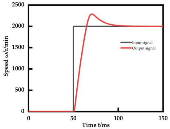 The joint simulation of Simulink and AMESim takes into account the control algorithm and dynamic properties of the motor itself, so it is closer to the actual results. The model for the joint simulation is shown in Figure 12. The result obtained from the control of the motor with the controller model in Simulink is used as an input signal to the EHA system. The actual rotor angle of the motor is fed back to the controller in Simulink through the angular displacement sensor in AMESim, thus realizing the purpose of joint simulation. The purpose of introducing the motor controller for simulation is to speed up the response of the motor rather than the tracking accuracy of the motor speed and position, so the proportional link coefficients of the PI controller can be increased as much as possible to increase the response speed of the motor and thus improve the overall dynamic properties of the miniature EHA system. The parameters of the current loop and the speed loop are shown in Table 4.