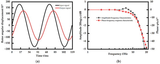 The dynamic properties of the motor for the experiment were first tested. The micro 2D pump requires a constant 180° forward and reverse rotation. The forward rotation is used to supply the pressurized fluid, while the reverse rotation is used to recover the pressurized fluid and avoid backflow in the hydraulic lines. When the micro 2D pump is activated, the forward rotation system provides the high-pressure fluid to drive the power actuator, while the reverse rotation system recovers this pressurized fluid and prevents it from flowing back into the hydraulic lines through the reverse rotation function. If the micro 2D pump does not have a forward and reverse function, then at the end of the work of the hydraulic mechanism, the pressurized fluid in the hydraulic line will flow back into the hydraulic pump, causing damage to the miniature pump. As a result, the dynamic properties of the DC brushless motor are investigated under the conditions of 180° forward and reverse rotation. Figure 15 shows the speed step response of this motor and Figure 16 shows the frequency response of this motor. In a no load situation, the motor has a rise time of 19 ms and an overshoot of 17.8% at a speed step input of 2000 r/min with almost no steady state error. On the other hand, the frequency bandwidth of the motor is about 17 Hz, and it can be seen that the amplitude–frequency decay is faster than the phase decay due to the phase compensation technique used in the control algorithm. So, later on, when studying the frequency properties of the EHA, the frequency at which its amplitude decays at −3 dB is taken as the frequency bandwidth.