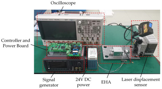 An experimental stand was built based on the miniature EHA prototype, which is mainly composed of the EHA system, controller, power supply, computer, oscilloscope, etc., as shown in Figure 17.