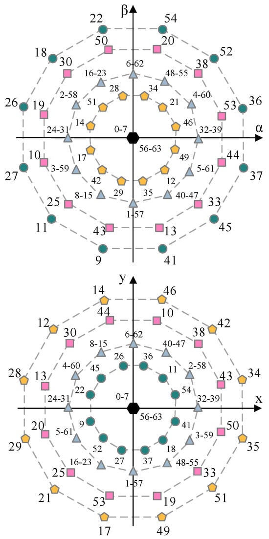 Figure 2 shows the 64 available switching states mapped onto the and x-y subspaces. These voltage vectors are typically termed using the decimal number corresponding with their binary codification of the switching vector . Focusing on Figure 2, it is observed that these available voltage vectors may be grouped into four concentric dodecagons according to their magnitude in the principal plane, termed large (), medium-large (), medium () and small () vectors. On the other hand, there are four switching states with a null production in both subspaces.