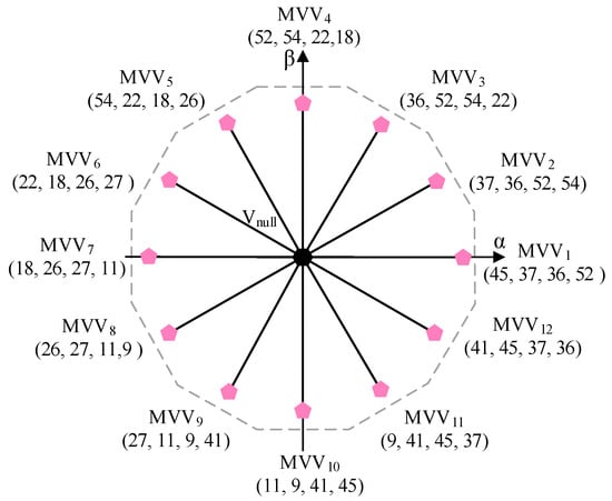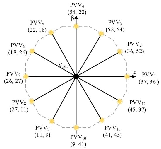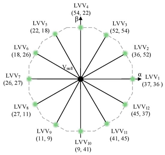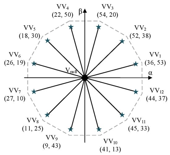 and , where is the sampling period. Following this approach and taking into account the number of available large voltage vectors, 12 active VVs can be generated for the considered 6PH-IM (Figure 4).
