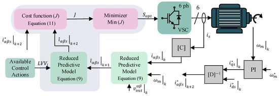 After the prediction stage, to avoid the one-step delay [], a second prediction step () permits estimating the future currents generated for each available switching state within the sampling period. All these predicted currents are evaluated using a cost function that includes the control objectives. A popular cost function for multiphase electric drive [] is the one introduced in (6):