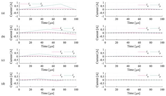 Theoretical analysis of x-y currents for the different control actions applied in the evaluated multi-vector MPC strategies. (a) VV-MPC, (b) LVV-MPC, (c) PULLA-MPC and (d) MV5-MPC. Left column is 6PH-IM1 (low stator impedance) and right column is 6PH-IM4 (high stator impedance).