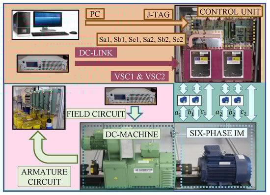 In this work, a multiphase electric drive is employed. Specifically, the selected one is formed by an asymmetrical six-phase induction machine (6PH-IM) supplied by a dual two-level three-phase voltage source converter (2L-VSC). Regarding the 6PH-IM, it is composed of two sets of three-phase windings. These stator windings are distributed and spatially shifted 30° and each three-phase set has a star connection with independent neutral points. The use of two isolated neutral points permits simplifying the regulation schemes. As shown in the topology included in Figure 1, each three-phase winding set is fed exclusively by a 2L-VSC. Moreover, both 2L-VSCs are connected to a single dc-link.
