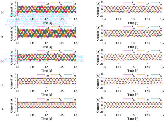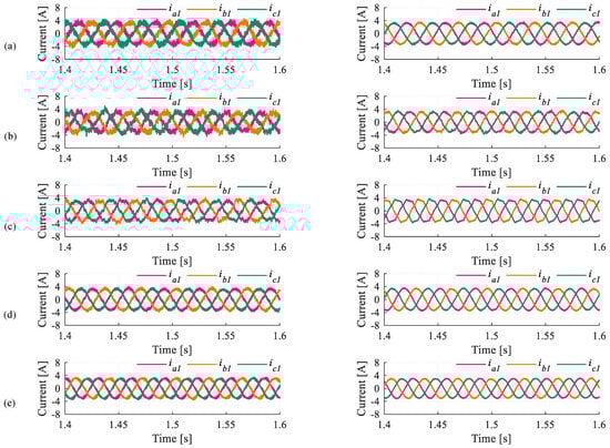 As mentioned, the switching pattern applied in the sampling period presents a paramount effect on the harmonic content of the current signal. In the considered 6PH-IM with distributed windings, the switching states with an active production in the principal plane also generate a voltage output in the secondary. Consequently, this results in the injection of unwanted current harmonics. For this reason, the designer must evaluate the influence of IF2 on the waveform quality and on the rest of the intended electric drive features. Such injected currents are the response to the application of the x-y voltage output in an circuit where the leakage stator inductance is and the stator resistance , as has been described in []. Figure 12 shows the evolution of the x-y currents resulting from the application of one active control action of the considered multi-vector MPC strategies. Furthermore, Figure 12 presents the x-y currents obtained with low and high stator impedance values since the impact of IF3 should be considered. The theoretical study included in Figure 12 about the x-y currents warns about its influence. Focusing on the left column of Figure 12a (VV-MPC scheme), the so-called is clearly observed []. Two active voltage vectors, large and medium-large, are applied in the same sampling period to cancel on average the x-y voltage generation. However, the peak values are not taken into account, resulting in high values of peak-to-peak (PtP) x-y current values and worsening the current quality. MV5-MPC also permits nullifying the x-y voltage generation in a sampling period. Nevertheless, in this case, the application of four active large voltage vectors and the null vector allows for reducing the PtP current values (Figure 12d). It is noteworthy that, due to the increase in the stator inductance, the differences among the selected multi-vector approaches can practically be neglected from the point of view of the secondary components. In this work, all the assessed multi-vector control schemes are performed using the same sampling period. Thus, a higher current quality is expected in those regulation schemes that apply a higher number of switching states in the sampling period.