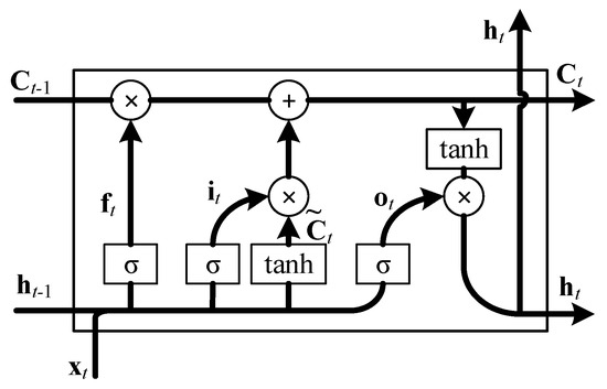 LSTM is a special type of RNN. A unique innovation of LSTM is the introduction of an internal cell state to avoid the gradient vanishing or exploding problem [23], as shown in Figure 1. The inputs of an LSTM block are input features xt (dimensions Nx × 1), the cell state Ct−1 (dimension Nh × 1), and the hidden state ht−1 (dimensions Nh × 1). The outputs of an LSTM block are the cell state Ct (dimensions Nh × 1) and the hidden state ht (dimensions Nh × 1) at time t. This input information will first pass through the forget gate as follows, which determines the information to throw away from the cell state Ct−1.