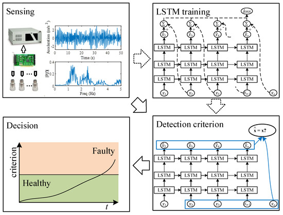 Figure 3 illustrates the procedure of deep LSTM for fault detection. First, the sensors and the data acquisition systems are installed, which are essential prerequisites. Next, the collected data are utilized to train the deep LSTM model. Following training, additional monitoring data are gathered and fed into the previously trained deep LSTM, resulting in an estimated series. The detection criterion is then determined by comparing the similarity between the estimated time series and the actual collected data. Finally, with the established criterion and a decision limit in place, fault detection is feasible.
