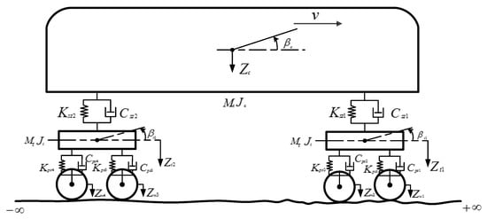 A railway vehicle suspension model [40,41,42], as depicted in Figure 4, is used for generating vertical railway suspension dynamic responses. The model has six degrees of freedom: the bounce Z and pitch β of the car body and the two bogies (front and back). The equations of motion are given in [42], as well as the parameters.