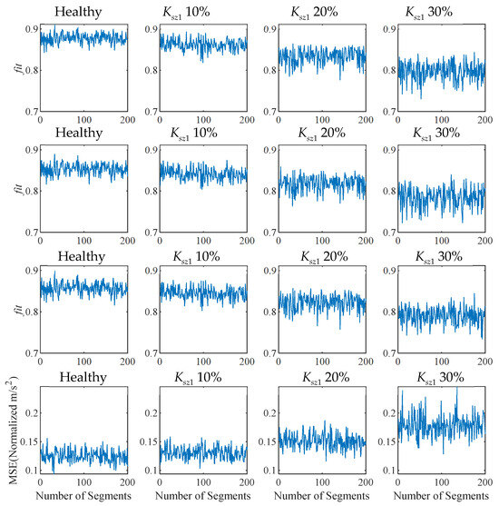 To show the motivation behind selecting the goodness-of-fit value as a fault detection criterion, instead of the MSE, the MSE value of the deep LSTM residual is presented in Figure 5. The MSE of the residual, essentially a Euclidean distance [24], has been widely used by researchers [25,38] as a fault detection criterion. As shown in Figure 5, the MSE value increases as the fault severity increases. This implies that the more severe the fault is, the larger the prediction error will be.