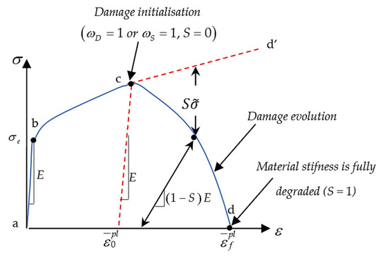 The damage process is described by three phases: initiation of the damage at a deformation level and evolution of the damage accompanied by increased loading and rupture. The initiation phase of the damage can be characterized by the following relationship (Equation (6)):