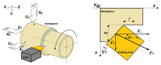 where and are the cutting forces coefficients calculated according to their analytical expressions described in [24]. Note that , and directions are equivalent, respectively, to the depth of cut, the cutting velocity, and the feed directions.