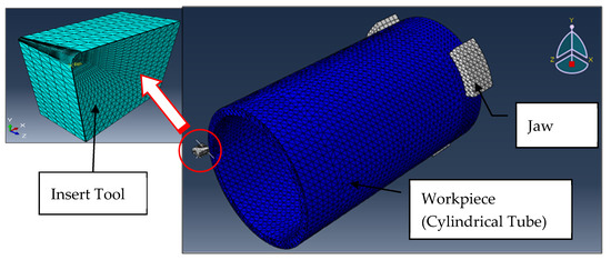 The workpieces are modeled with thin tubes with a length “L” equal to 200 mm and an internal diameter “D” equal to 100 mm. The wall thicknesses “ep” depends on the machining operation: For a roughing operation, the considered thicknesses are 3, 4.5, and 6 mm. And for a finishing operation, the wall thickness is 1.5 mm. The workpieces are considered to be deformable and meshed with linear tetrahedral elements C3D4. The highest mesh density is located in the zone contact between the workpiece and the cutting tool zone, where the mesh size is between 0.1 mm and 0.01 mm. In the remaining zones, a coarse mesh is applied with a size of around 5 mm in order to reduce the element number and, therefore, time computation. The default ALE-adaptive mesh parameters were adopted in this simulation. The smoothing algorithm is determined using an analysis product with a meshing predictor set to the current deformed position because it is recommended for problems with very large distortions. The advection parameter is set to second order to use a second-order algorithm to remap solution variables after adaptive meshing has been implemented. The time step adopted in the simulation is 0.5 ms. The time step is small enough to collect the data in different valuable steps.