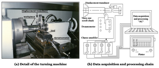 The experiments consisted in measuring firstly the cutting force components , , and along radial, tangential, and axial directions, respectively, and secondly, the tangential workpiece vibrations along the y direction. The experimental setup is illustrated in Figure 4. The measurement of the cutting forces components along the three directions x, y, and z, is conducted using a three-axial force piezoelectric dynamometer, which can measure the cutting force components signals in three directions during the active cutting process. The workpiece vibration along the y direction is measured using a capacitive sensor without contact fixed at a distance of 0.5 mm to the free end of the workpiece. The engine lathe is equipped with a 20 kW DC motor. The rotation speed is controlled using an electronic regulator. The signals received from the dynamometer and the sensor are acquired using a data acquisition system and analyzed using Matlab software (V 7.0.1.24704 R14).
