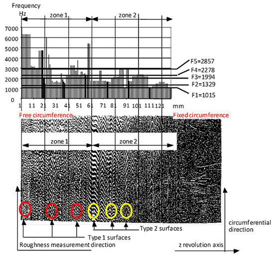 The experimental results of the twelve performed tests (with the parameters described in Table 2) are summarized in Table 4. The observation and analysis of the different traces marked by the cutting tool on the machined part surface of the workpiece (Figure 5) show that in the case of the vibrated process, two types of weary surfaces and two zones can be observed on the lateral surface. The first type of weary surface (Type 1) is complex. It presents multiple shock effects on the surface. This first type corresponds to a heavy chattering phenomenon for which the cutting tool does not work in continuous conditions, and the contact appears to loosen intermittently. This surface is located in a first zone (zone 1) from 0 to 60 mm along the revolution z-axis. This zone constitutes the most distant from the chuck.